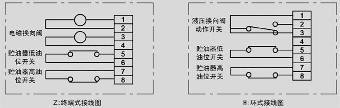 终端式结构电动润滑泵配用电磁换向阀,有二个接口,外接二根供油主管,依靠电磁铁的得失电实现换向供油。 柱塞泵换向阀的动作原理详见使用说明书。