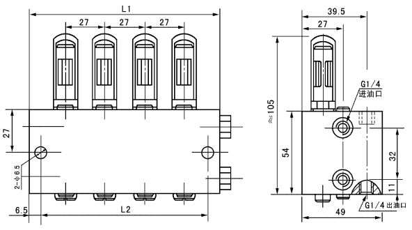 该型分配器适用于公称压力为40MPa的双线式干油集中润滑系统中,作为一种计量给油装置。它在两条供油主管交替的供油压力作用下,直接由供油的压力控制活塞动作给油,完成向润滑点定量分润滑脂的功能。