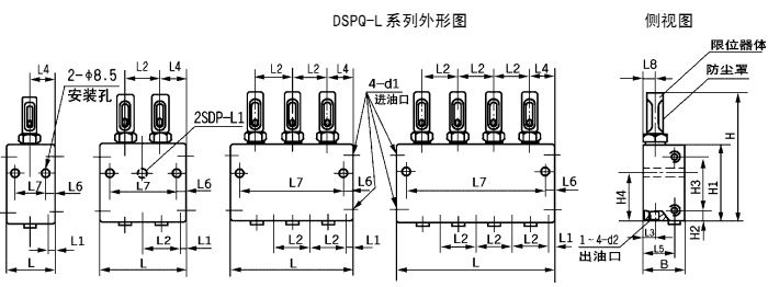 DSPQ-L系列单向出油的双线分配器,只在下面有出油口,活塞正向、反向排油时都由下出油口供送润滑脂。其形式与尺寸见图和表的规定。