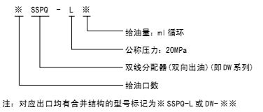 2、SSPQ(DW)型分配器对应出口均需合并时,订货时在 SSPQ 后加注下标即 SSPQ1 或 DW- ※※ H;不合并时最后的 “H”不带。 |