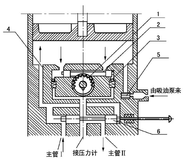 手动润滑泵供脂是靠人工扳动手柄,通过小齿轮1带动具有齿条的压油柱塞2作往复运动来实现的。当柱塞处于(下图所示)右端极限位置时,左端油腔容积增大形成真空,于是贮油筒内的润滑脂在大气和活塞压力的作用下进入左 端油腔内。当柱塞向左移动时,挤压润滑脂顶开单向阀4经换向阀进入输油主管II内;此时,柱塞右端油腔容积逐渐增大,润滑脂被吸入,在柱塞返回向右移动时,充满润滑脂的油腔又逐渐变小,这样挤压润滑脂,顶开单向阀3经换 向阀流进输送主管II。供油过程中的换向是通过换向阀6实现的。当把换向阀手柄拉出时,润滑脂从主管I排出;当把换向阀手柄推进时,则润滑脂从主油管II排出。