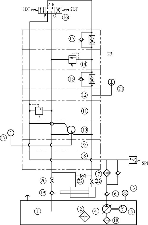 当窑体上移到上限值时,行程开关箱中一触点动作,油泵 4 停止,换向阀 16 的电磁感应圈 B 接通,液压缸中的油经调速阀 13 和换向阀 16 右位回油箱,窑体靠自重下移,下移到下限值时,行程开关箱中一触点动作,换向阀 16 的电 磁感应圈 B 断开,油泵 4 起动,换向阀 16 电磁感应圈 A 接通,液压缸活塞在压力油作用下,推动挡轮迫使窑体向上移动。