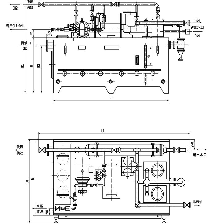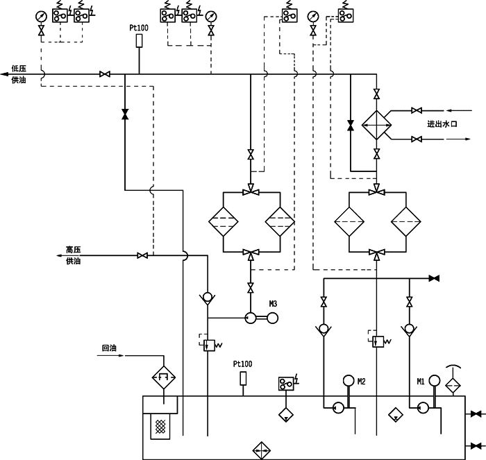 本油站为整体式,由油箱、两台低压油泵、一台高压油泵、二台双筒网片式过滤器、回油磁网过滤装置、列管式 油冷却器、各种控制阀门、管道以及电接点压力表、铂热电阻等组成。
