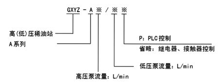 如采用 A 系列,高压流量为 2.5L/min;高压压力为 31.5MPa,低压供油压力为 0.4MPa;而低压供油量为 40L/min 的高(低)压稀油站,采用 PLC 控制的则按如下方法标注:GXYZ-A2.5/40.