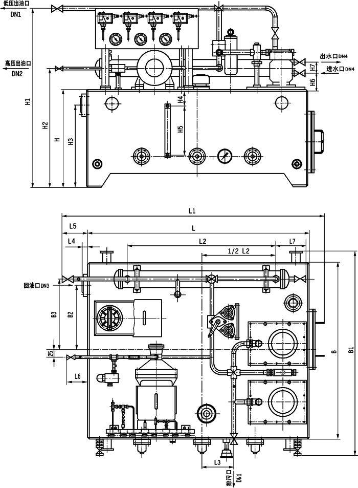 稀油站的高压部分压力为 31.5MPa,流量为 2.5L/min,低压部分压力为 0.4MPa;流量为 16~125L/min,稀油站具有过滤、冷却、加热等装置和联锁、报警、自控等功能。