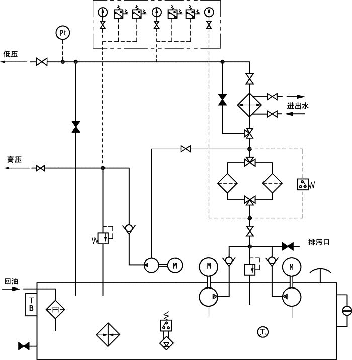 A系列的特点为高压流量,高压压力和低压压力均不变;低压流量则根据生产工艺要求不同而选定的高(低)压稀油站。